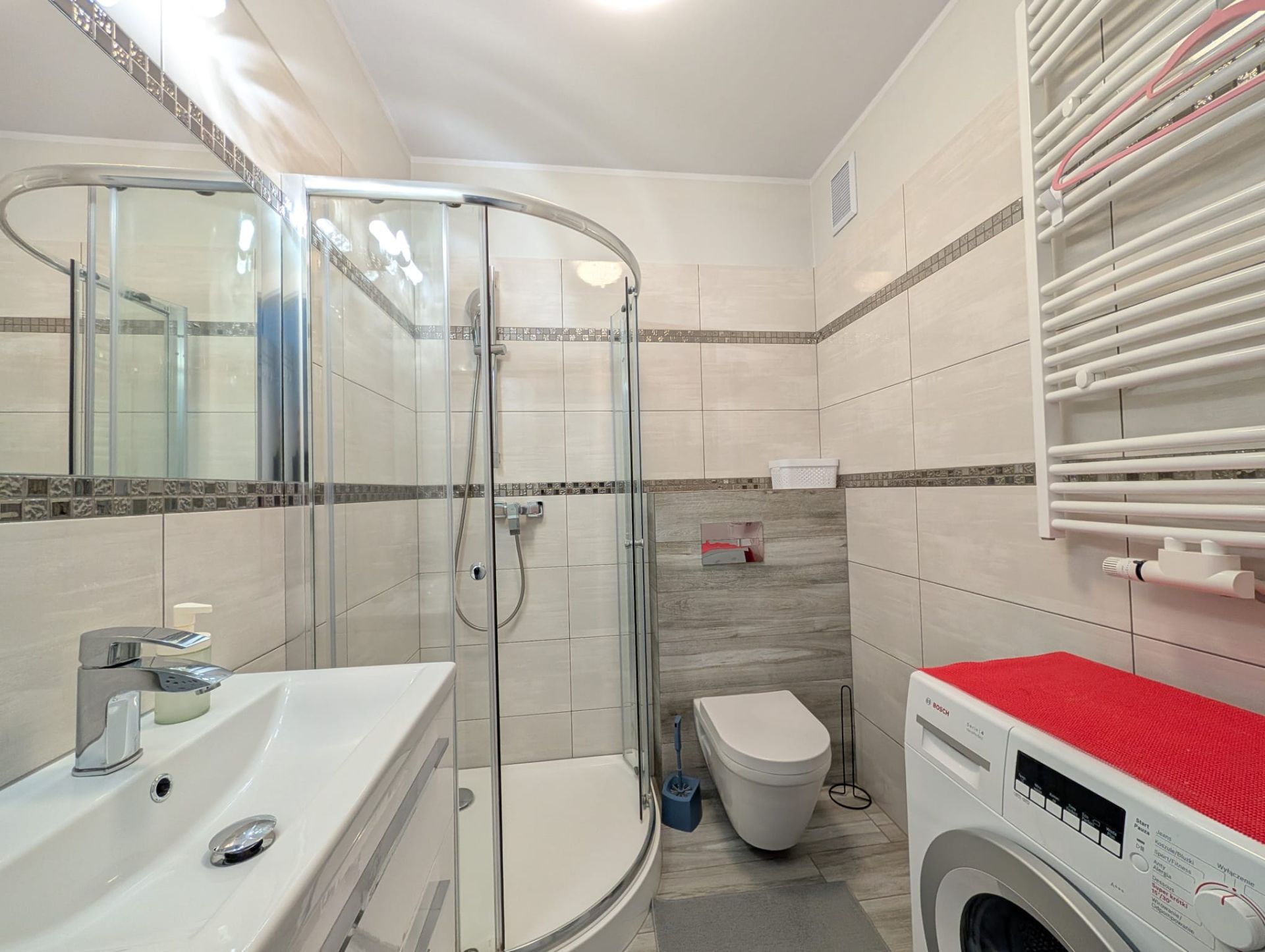 Aneks kuchenny jest w pełni wyposażony i pozwala na samodzielne przygotowywanie posiłków. Znajduje się w nim płyta grzewcza, piekarnik, lodówka, toster oraz kolbowy ekspres do kawy. Do dyspozycji gości jest również pralka, co znacząco podnosi komfort pobytu, szczególnie przy dłuższym wypoczynku.