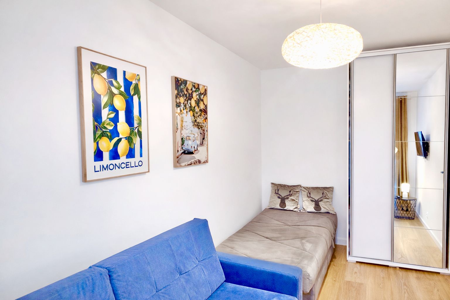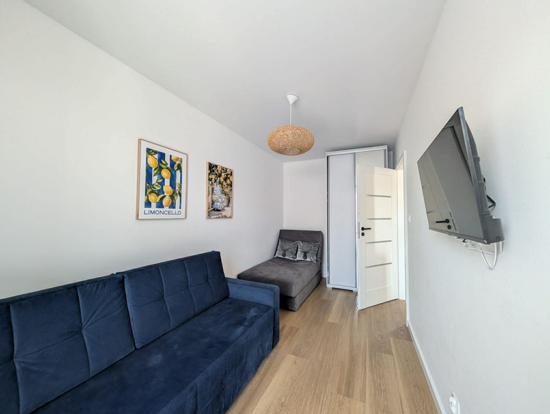 W sypialni znajduje się kolejna rozkładana sofa, która może pomieścić dwie osoby oraz jedno pojedyncze łóżko.