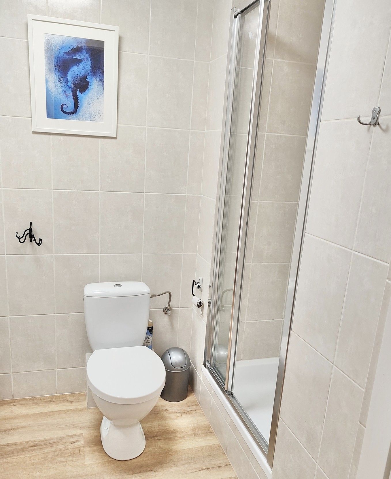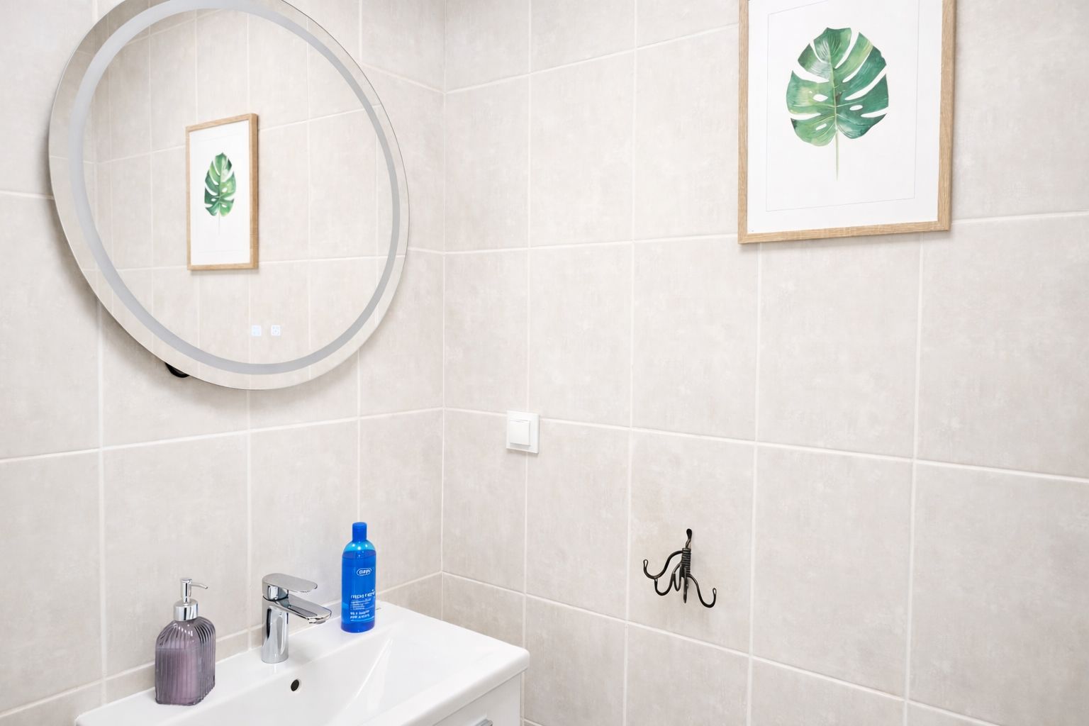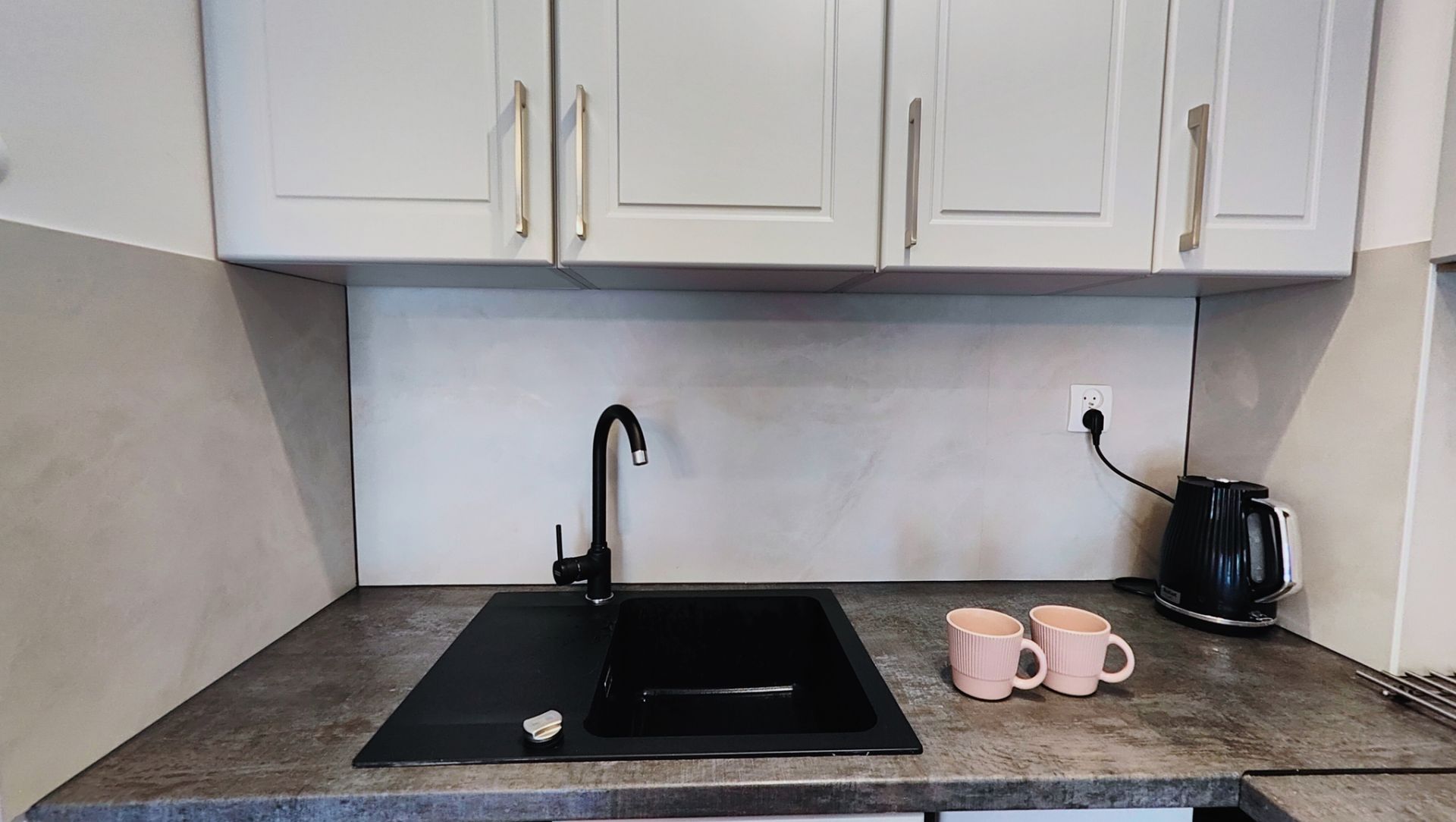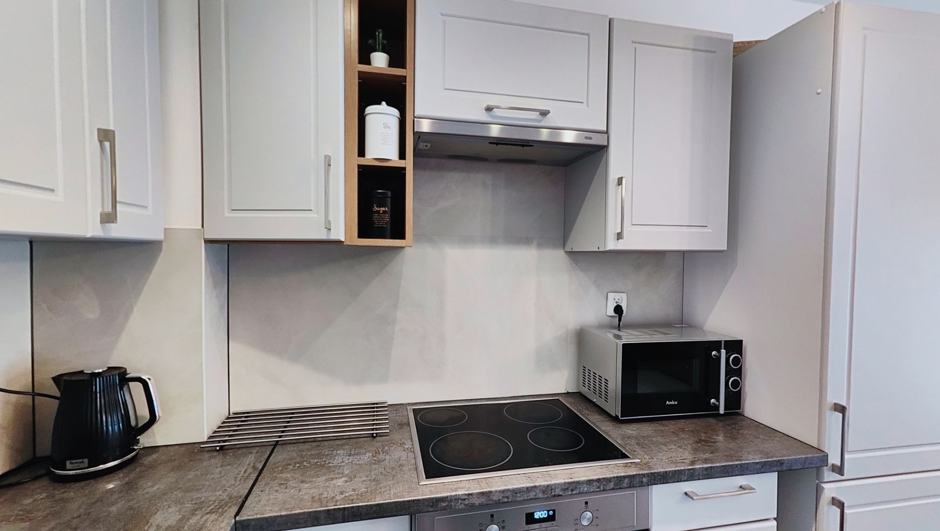 Aneks kuchenny jest w pełni wyposażony – znajduje się w nim piekarnik, zmywarka, kuchenka mikrofalowa, toster oraz ekspres do kawy na kapsułki Tchibo, co pozwala na swobodne przygotowywanie posiłków. Dodatkowym udogodnieniem jest pralka, która sprawdzi się szczególnie podczas dłuższych pobytów.
