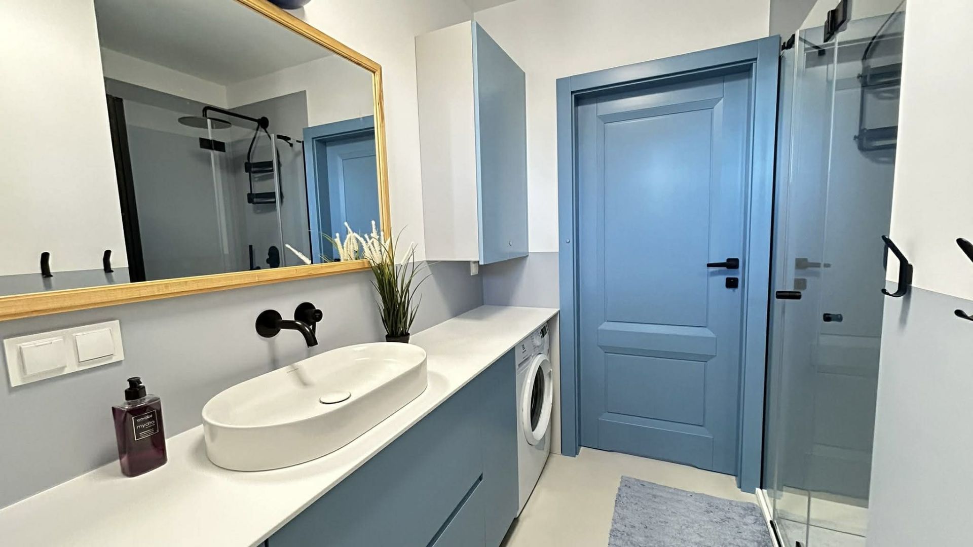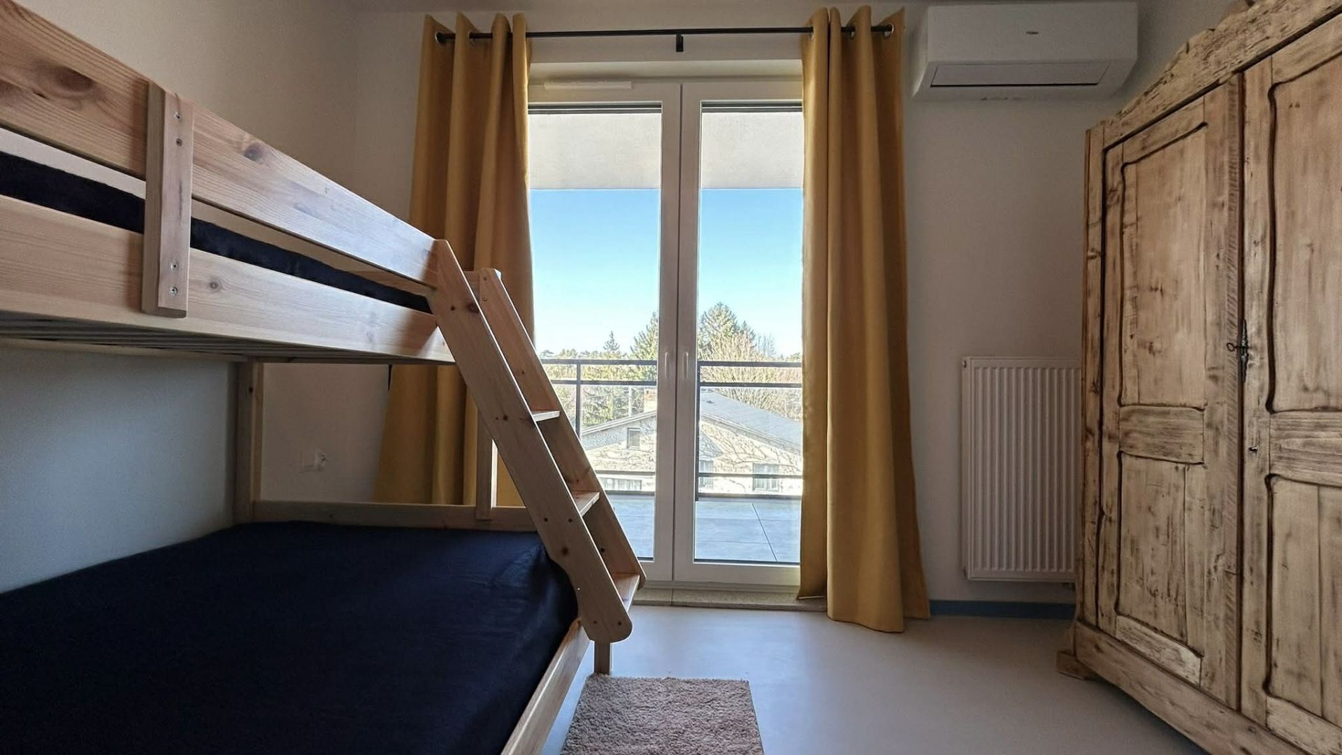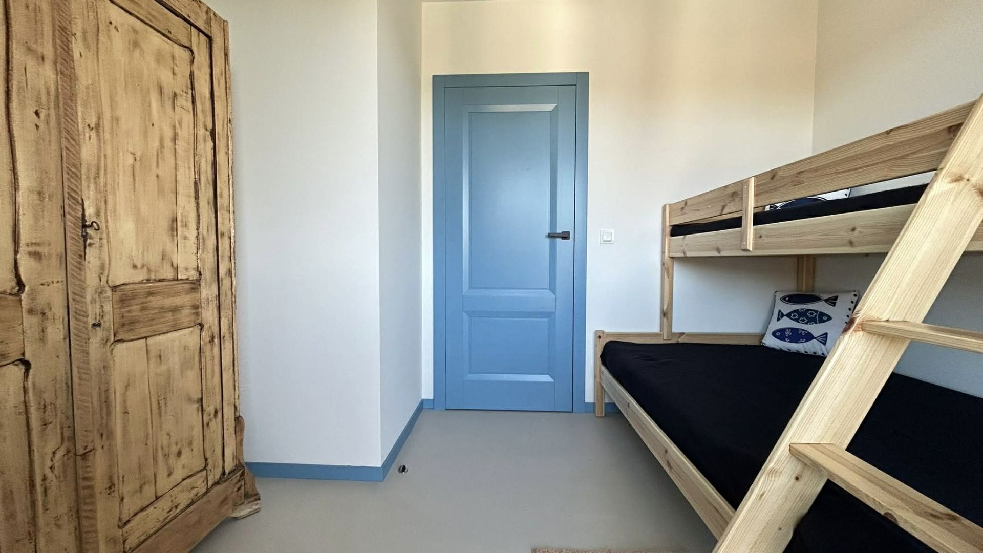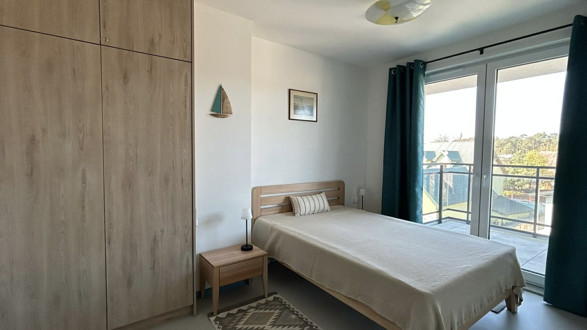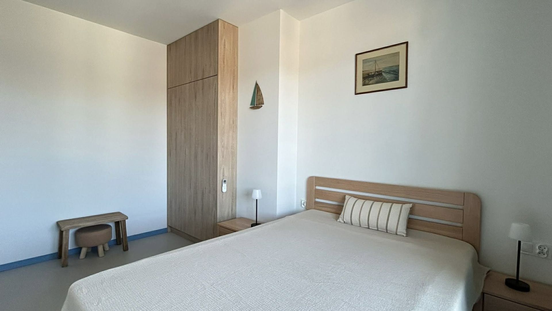 W apartamencie znajdują się dwie sypialnie – w jednej z nich jest wygodne łóżko małżeńskie, natomiast w drugiej łóżko piętrowe, co doskonale sprawdzi się dla dzieci lub dodatkowych gości. Łazienka wyposażona jest w prysznic, pralkę, ręczniki oraz suszarkę do włosów, zapewniając pełną wygodę podczas pobytu.