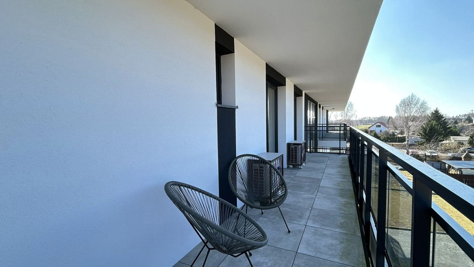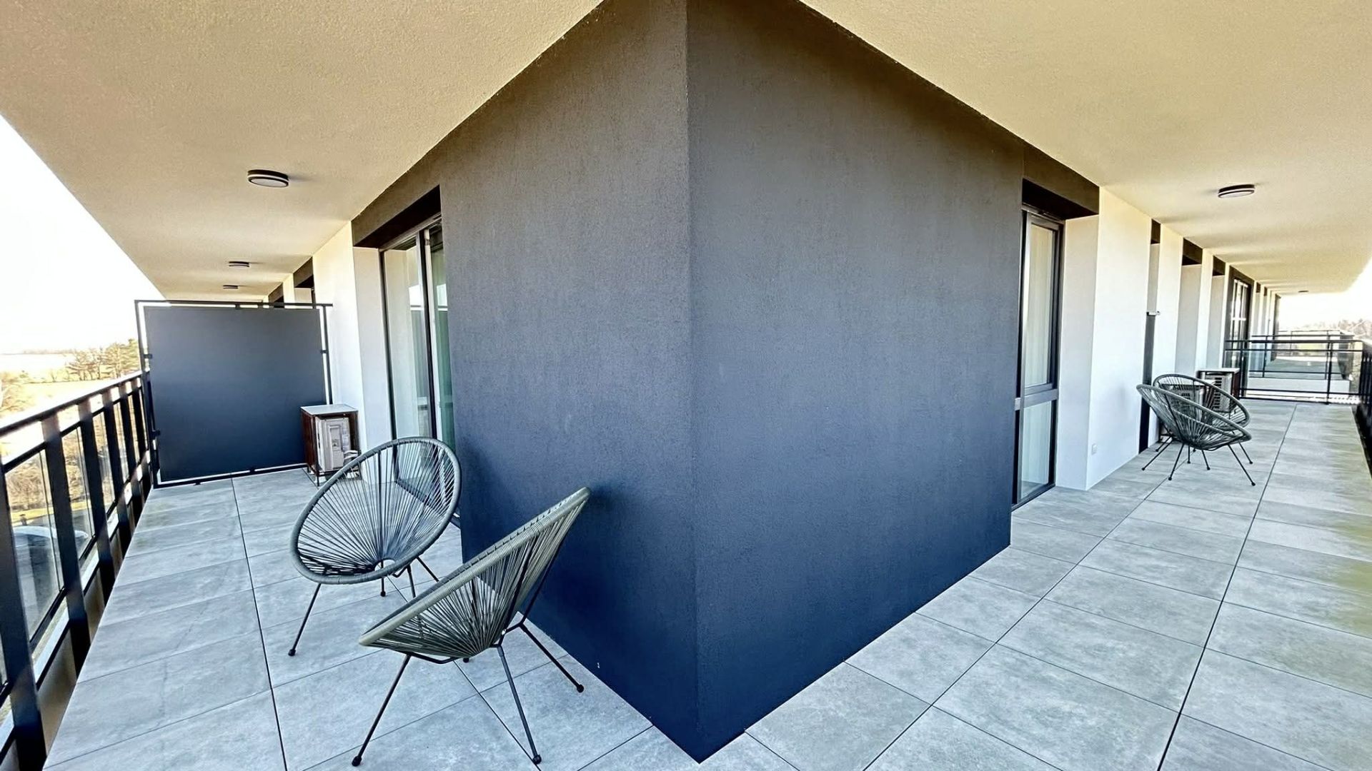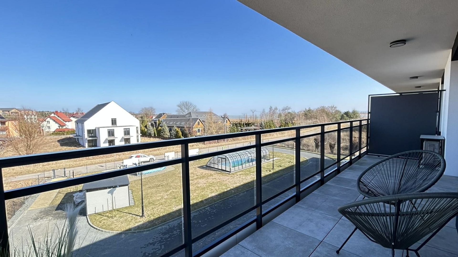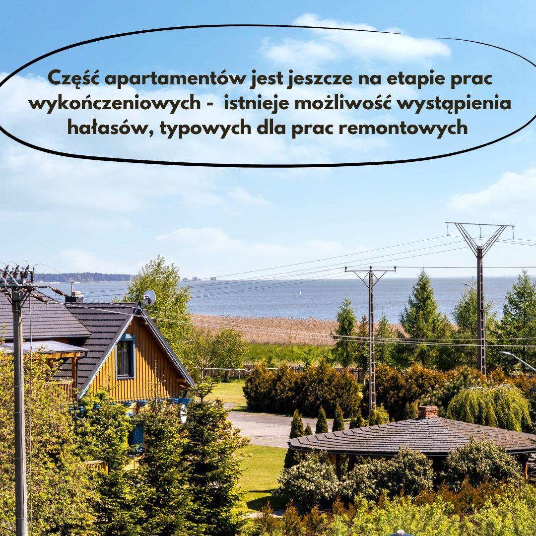 Wyjątkowym atutem jest duży, 33-metrowy narożny balkon z widokiem na Zalew Wiślany, wyposażony w wygodne meble ogrodowe – idealne miejsce na poranną kawę lub wieczorny relaks. Do dyspozycji gości jest również możliwość elektrycznego ładowania samochodu, prywatny boks na rowery, w którym znajduje się rower z siodełkiem dla dzieci, krzesełko do karmienia oraz łóżko dla niemowląt.
