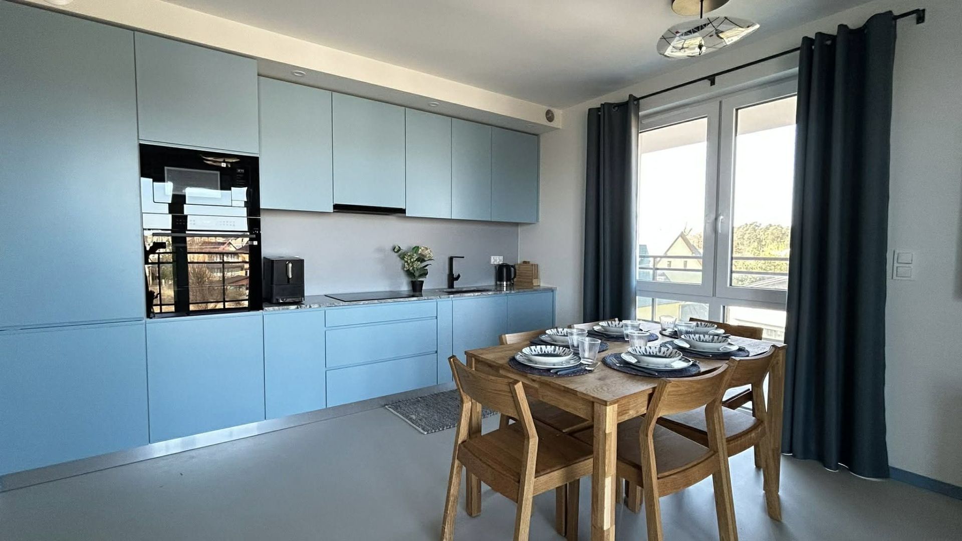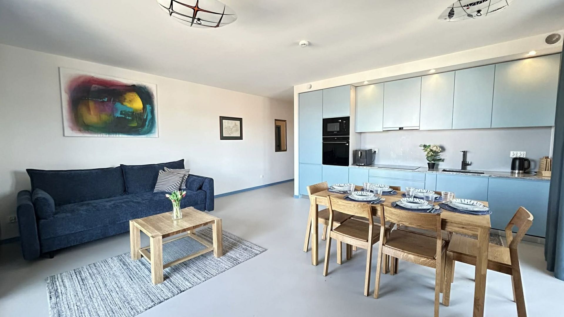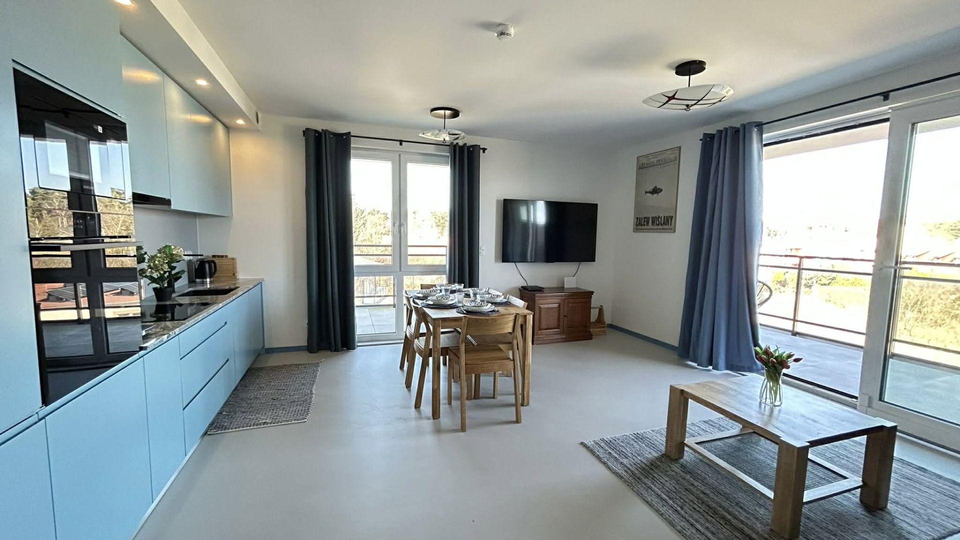 Sercem apartamentu jest przestronny salon z aneksem kuchennym. Kuchnia jest w pełni wyposażona – do dyspozycji gości jest lodówka, zmywarka, piekarnik, kuchenka mikrofalowa oraz ekspres do kawy na ziarna. W części wypoczynkowej znajduje się rozkładana sofa, telewizor, stół jadalniany oraz stolik kawowy. Dla komfortu gości apartament oferuje szybkie Wi-Fi oraz klimatyzację w każdym pomieszczeniu.