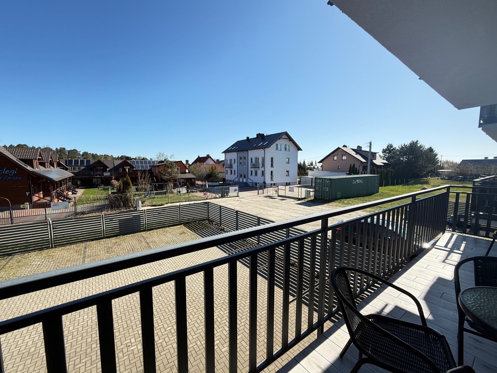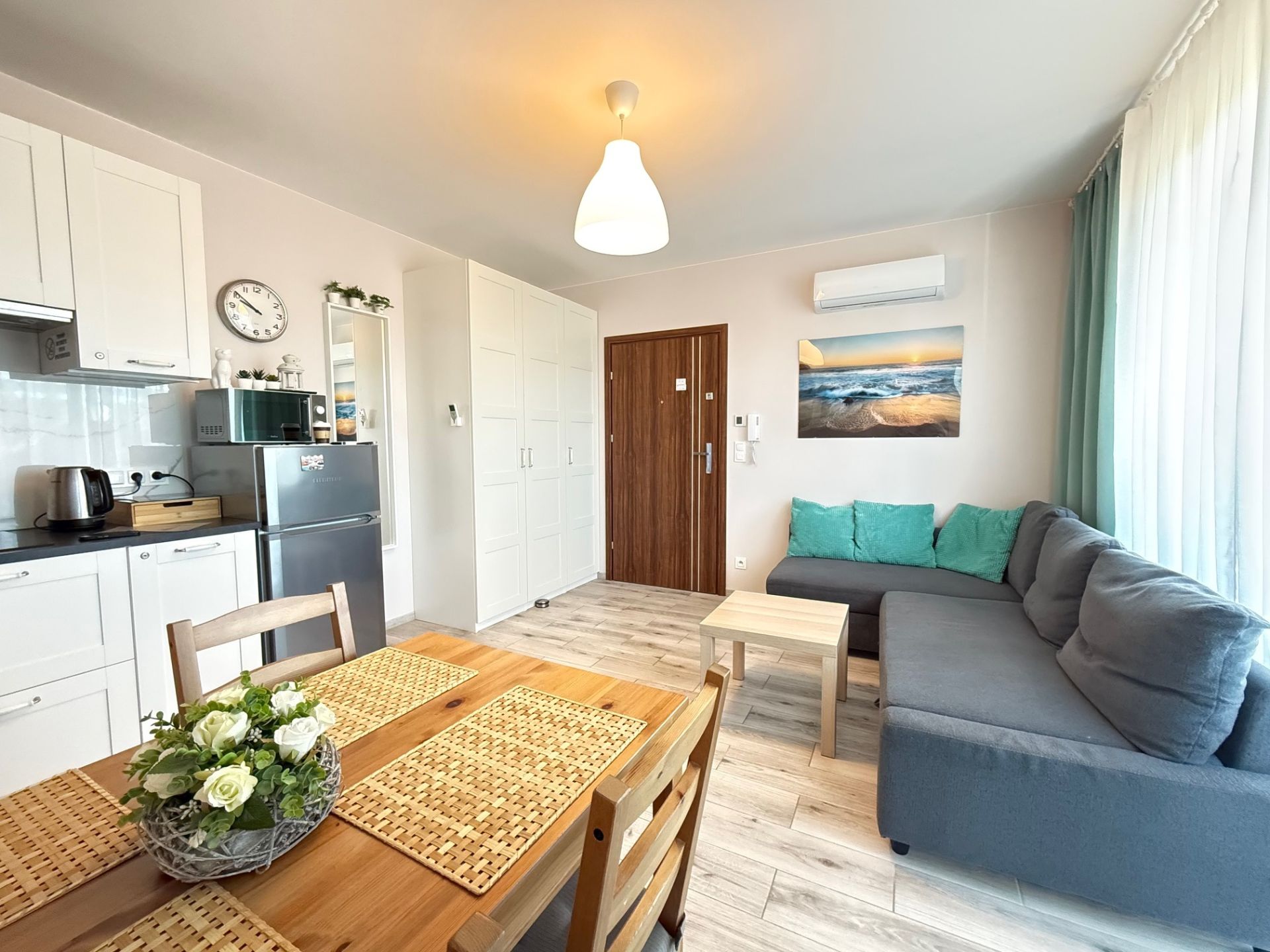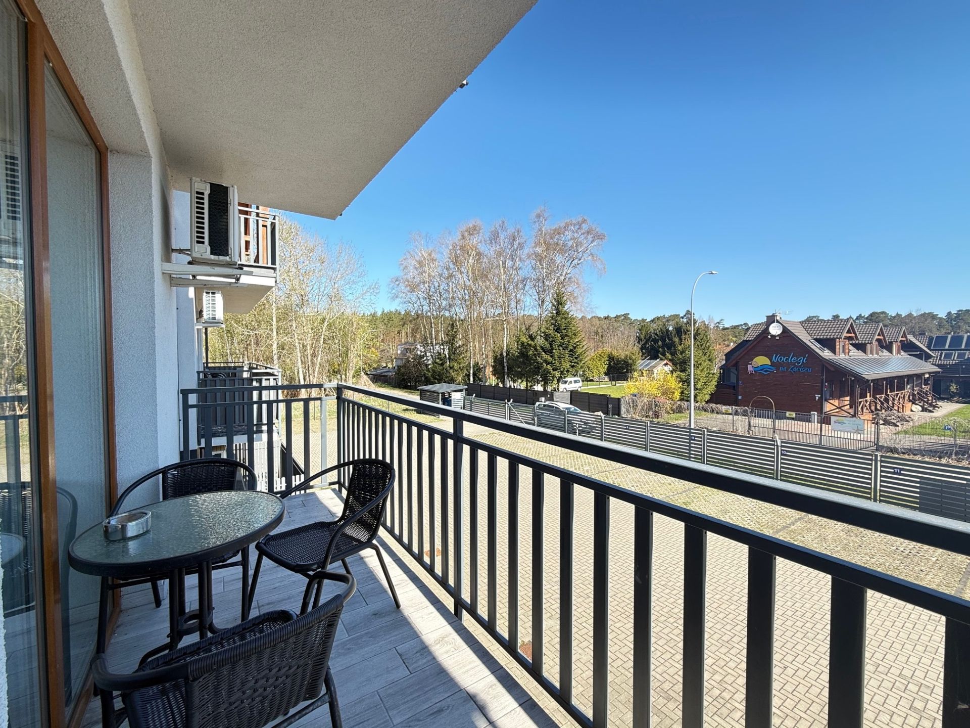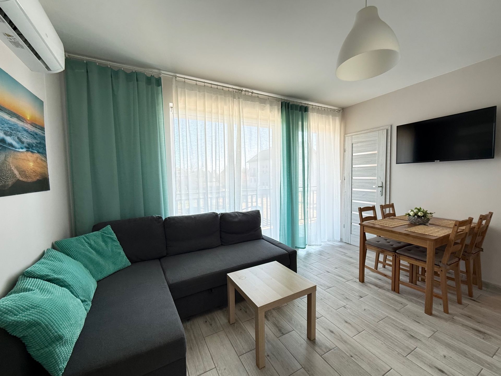 Z salonu można wyjść na balkon, gdzie poranna kawa smakuje wyjątkowo, a wieczory upływają w spokojnej atmosferze. Apartament wyposażony jest również w klimatyzację, gwarantującą komfort niezależnie od pory roku.