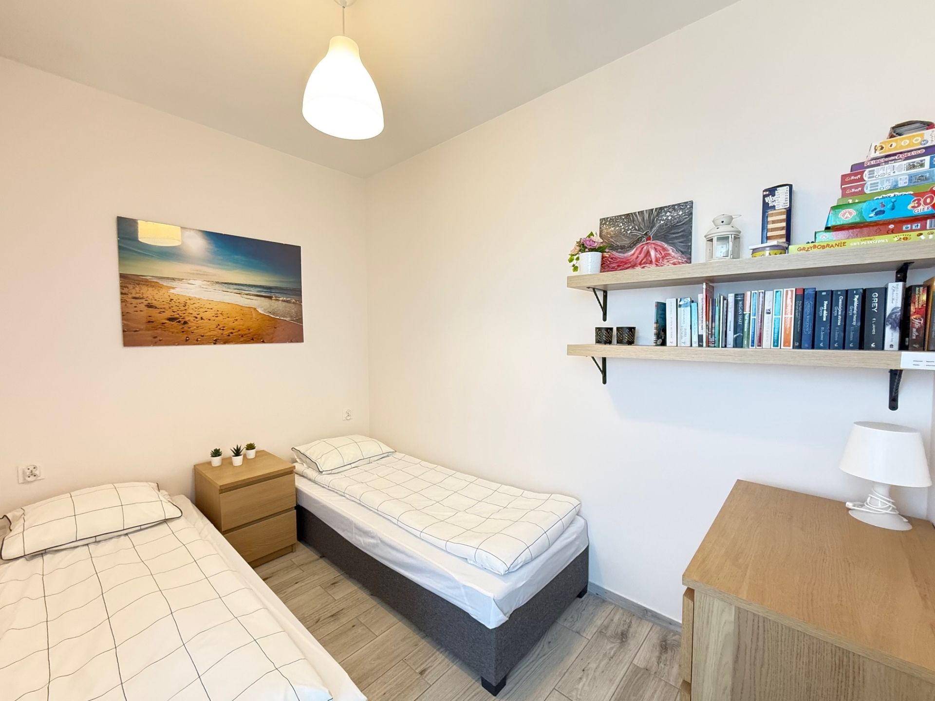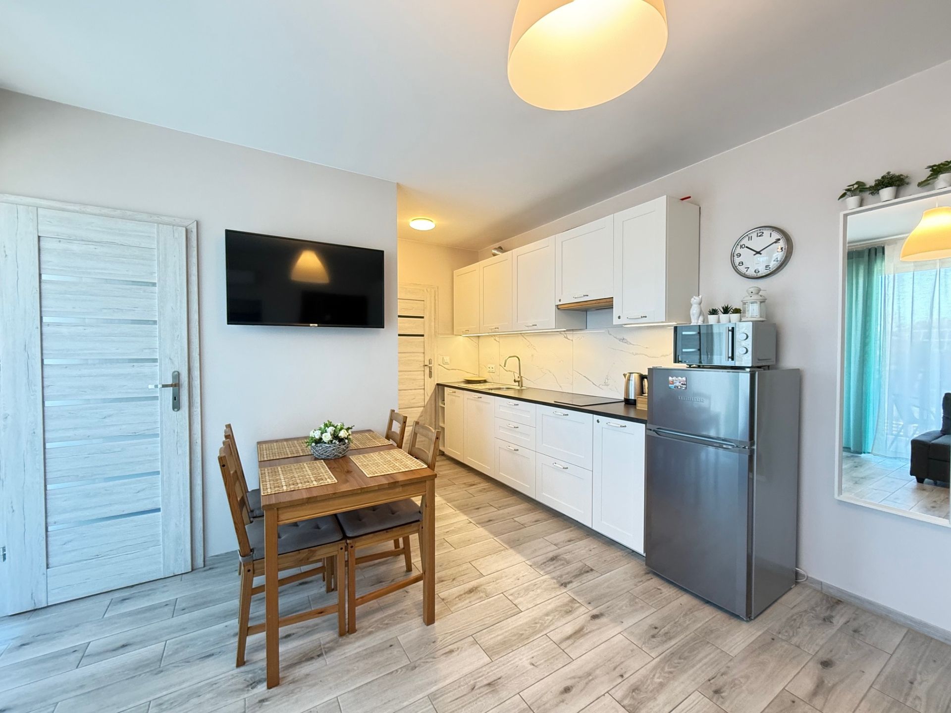 Apartament oferuje przytulną sypialnię z wygodnymi łóżkami, a także przestronny salon z aneksem kuchennym, który stanowi serce mieszkania – idealne miejsce do relaksu i wspólnego spędzania czasu. Aneks jest w pełni wyposażony w najpotrzebniejsze przyrządy i sztućce, a dodatkowo do dyspozycji gości apartament posiada mikrofalówkę, co zapewnia wygodę podczas przygotowywania posiłków.
